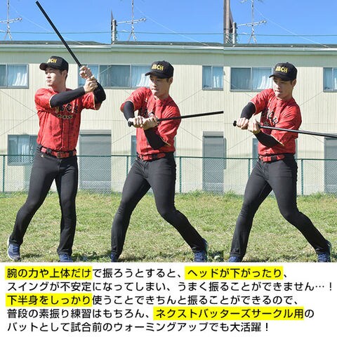 下半身をしっかり使うことできちんと振ることができるので、普段の素振り練習はもちろん、ネクストバッターズサークル用のバットとして試合前のウォーミングアップでも大活躍!