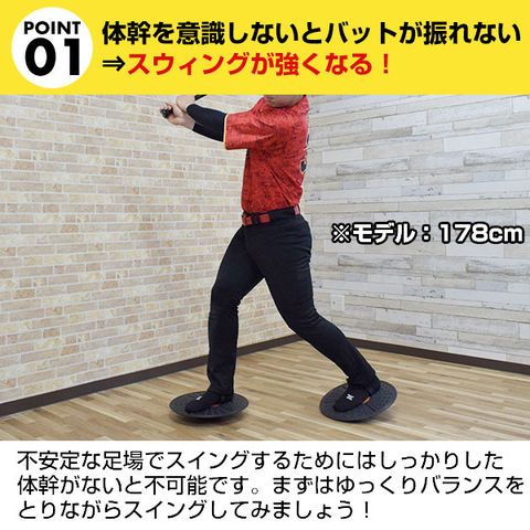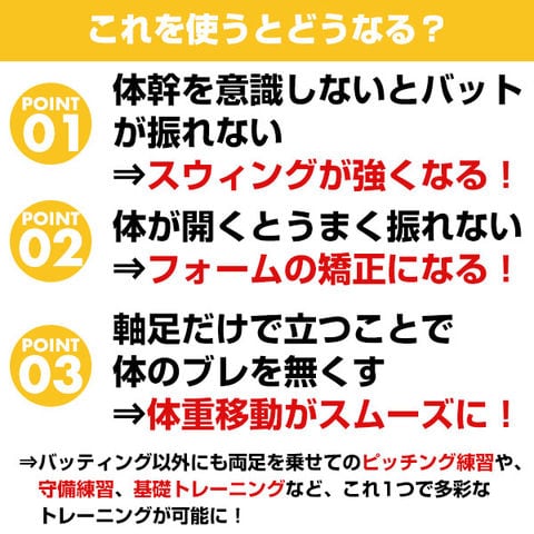 1枚での使用はもちろん、2枚あることで、両足を不安定な状態にできるので、バッティングやピッチング、フィールディングの練習にも活用できます。