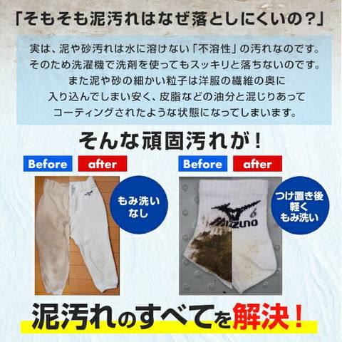 ガンコなユニフォーム・靴下等の泥汚れスッキリ!