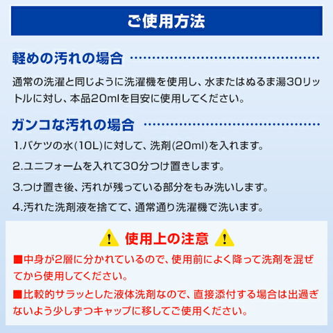 野球用の洗剤としては珍しい液体タイプの洗たく洗剤で、通常の洗濯機での使用はもちろん、ひどい泥汚れの場合は、つけ置き洗いでも大活躍!