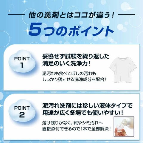 食べこぼしのシミ汚れや、上履き、運動靴の汚れにも効果があるので、大変な毎日のお洗濯をサポートします!●液体洗剤
