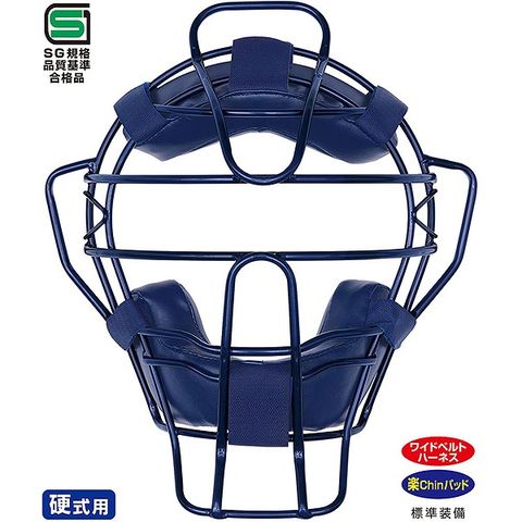 カーボンスチール軽量タイプ!肌にやさしいフィット型ステータスモデル球審用マスク。口元の圧迫感を解消し、発生音がよく通る新形状アゴパッド「楽Chinパッド」を標準装備。フレームにはヘッドガードが付いています。本製品は「一般社団法人 製品安全協会」のSG検査に合格したマスクです。