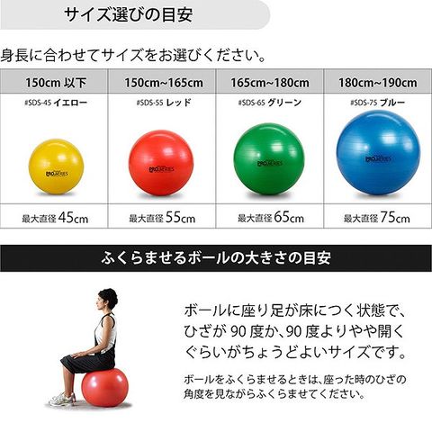 ※SDSエクササイズボールはより安全にエクササイズが行われるよう考慮し、万が一、パンクしてもゆっくりと空気がぬけるよう開発された商品です。