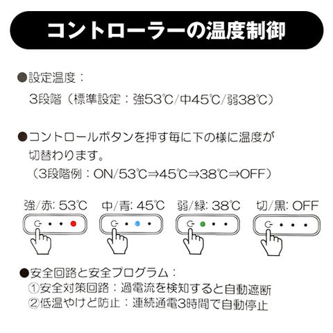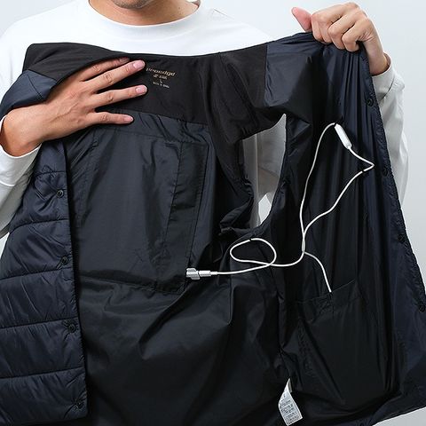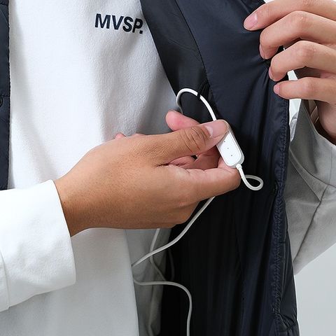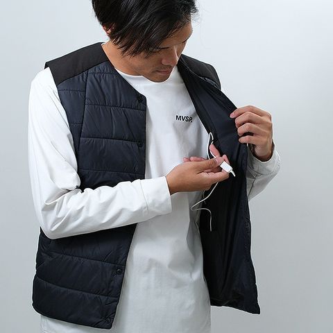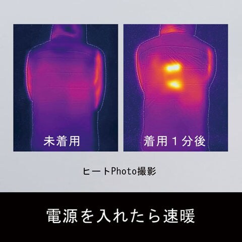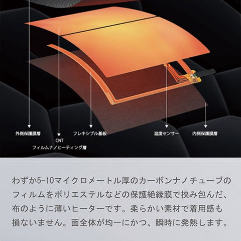 わずか5-10マイクロメートル厚のカーボンナノチューブのフィルムをポリエステルなどの保護絶縁膜で挟み包んだ、布のように薄いヒーターです。柔らかい素材で着用感も損ないません。面全体が均一かつ、瞬時に発熱します。■電熱パーツ:カーボンナノチューブヒーター採用