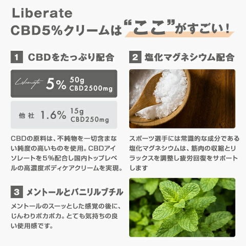 CBD スポーツ専用 ボディケアクリーム 50g(CBD2500mg)Liberate リバレイト ボディケア マッスル 筋肉 CBDクリーム マッサージ アスリート向け リカバリー 高濃度 高純度 アイソレート アンチドーピング 怪我 痛み 筋肉ケア 野球 ソフトボール 日本製