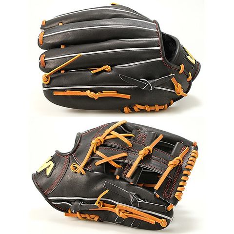 ハタケヤマの軟式ハイクラス、「TH-X」シリーズ。軟式にして硬式クラスの革を使用しているのが所以。ブラックにタン紐の王道カラーリングも人気です。