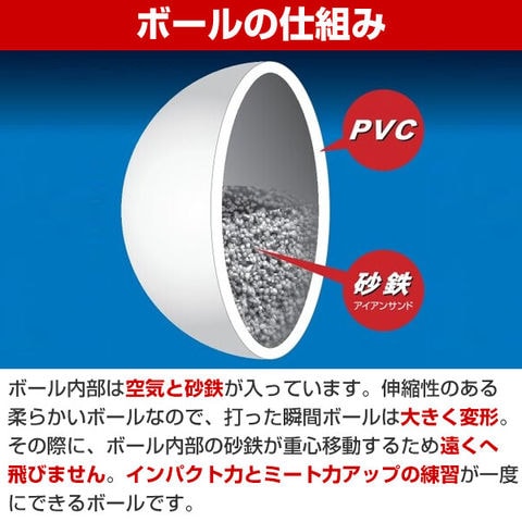 ティーバッティングやトスバッティングの練習用トレーニングボールです。中身に砂鉄が入っており、重量(約450g)のあるボールを打つことにより、芯で確実に捉える事ができないと前に飛ばすことが難しく、ミートポイントを把握できるようにします。また、同時にリストを鍛えることもでき、打撃以外のトレーニングとしては握力強化のトレーニングをすることもできます。