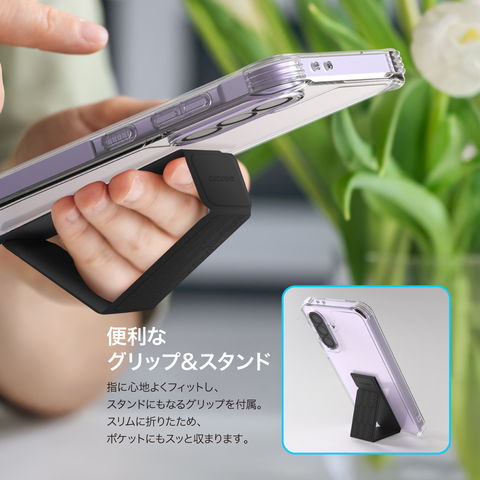 指に心地よくフィットし、スタンドにもなるグリップを付属。スリムに折りたため、ポケットにもスッと収まります。