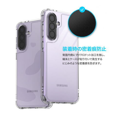 背面内側にマイクロドット加工を施し、端末とケースが貼り付いて発生するにじみのような密着痕を防ぎます。