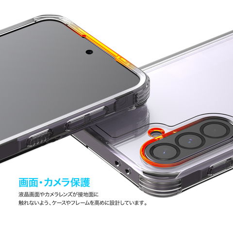 液晶画面やカメラレンズが接地面に触れないよう、ケースやフレームを高めに設計しています。