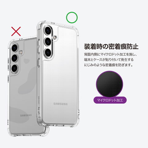 背面内側にマイクロドット加工を施し、端末とケースが貼り付いて発生するにじみのような密着痕を防ぎます。