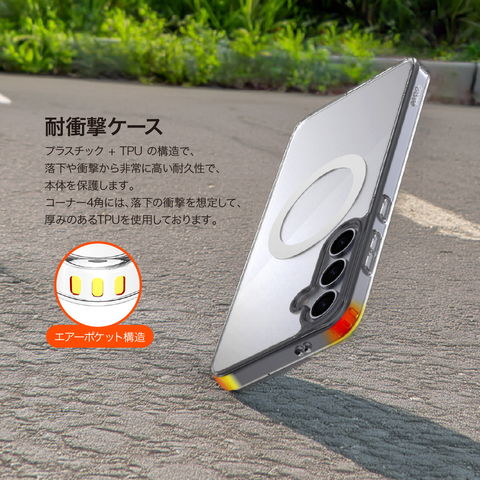 プラスチック + TPU の構造で、落下や衝撃から非常に高い耐久性で、本体を保護します。コーナー4角には、落下の衝撃を想定して、厚みのあるTPUを使用しております。