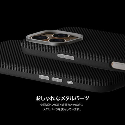 側面ボタン部分と背面カメラ部分にメタルパーツを使用しています。