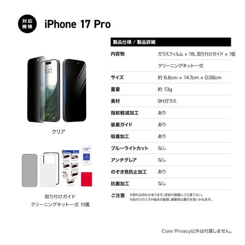 iPhone17Pro ガラスフィルム 覗き見防止 9H ガラス 保護フィルム ガイド付き フィルム iPhone 17 Pro iPhone17 Pro アイフォン17Pro 対応 araree Core Privacy
