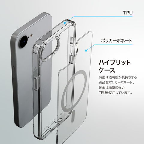 背面は透明感が長持ちする高品質ポリカーボネート、側面は衝撃に強いTPUを使用しています。