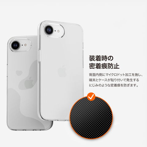 背面内側にマイクロドット加工を施し、端末とケースが貼り付いて発生するにじみのような密着痕を防ぎます。