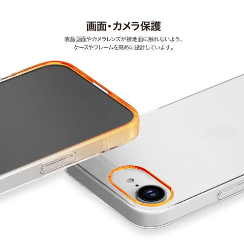 液晶画面やカメラレンズが接地面に触れないよう、ケースやフレームを高めに設計しています。