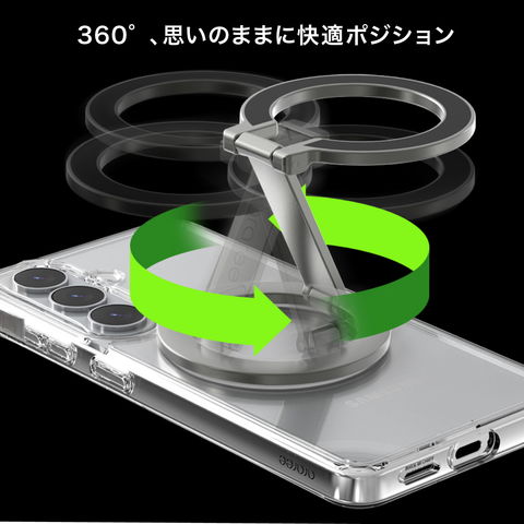 【製品特徴】… ◆ 装着方法 : マグネット 式 ◆ マグネット面 : 両面 ◆ スタンド機能 : あり ◆ スタンド角度調整 : 可能 ◆ ご注意 : ※取り外す際は、横にスライドするようにして取り外してください。※ワイヤレス充電時は、本製品を取り外してください。 ◆ ご注意 : ※手や指などを挟み込まないようご注意ください。※磁石使用のため、医療機器などから十分な距離を保ってください。また、磁気による機器やデータ等への損害や損失に関して責任を負いかねます。