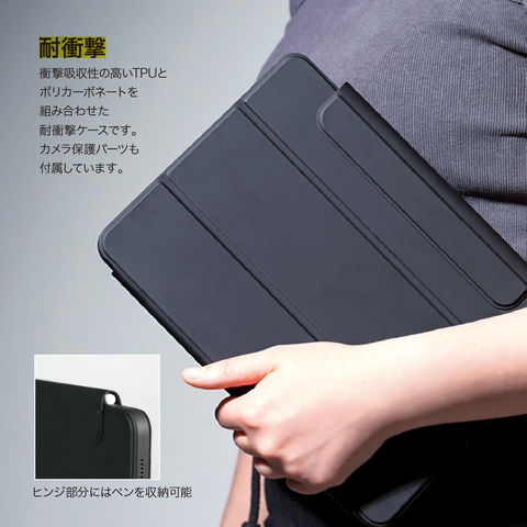 衝撃吸収性の高いTPUとポリカーボネートを組み合わせた耐衝撃ケースです。カメラ保護パーツも付属しています。