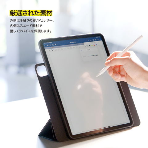 外側は手触りの良いPUレザー、内側はスエード素材で優しくデバイスを保護します。