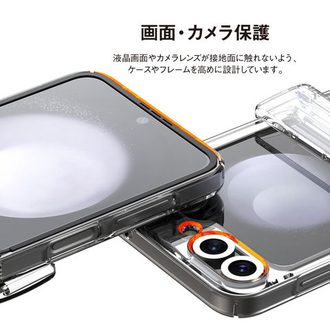 液晶画面やカメラレンズが接地面に触れないよう、ケースやフレームを高めに設計しています。