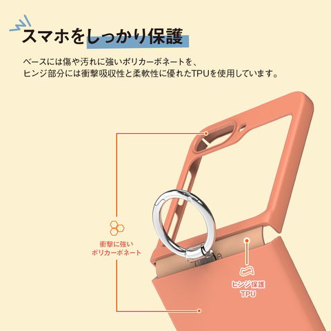 ベースには傷や汚れに強いポリカーボネートを、ヒンジ部分には衝撃吸収性と柔軟性に優れたTPUを使用しています。