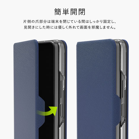 片側の爪部分は端末を閉じている間はしっかり固定し、見開きにした時には優しく外れて画面を邪魔しません。