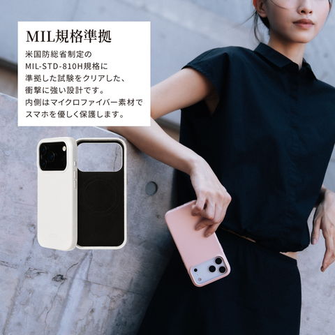 米国防総省制定のMIL-STD-810H規格に準拠した試験をクリアした、衝撃に強い設計です。内側はマイクロファイバー素材でスマホを優しく保護します。