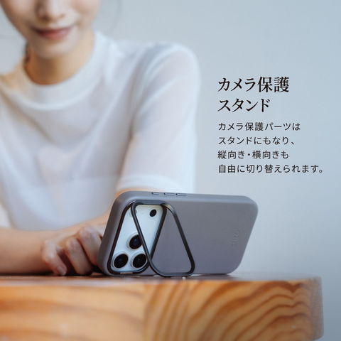 カメラ保護パーツはスタンドにもなり、縦向き・横向きも自由に切り替えられます。