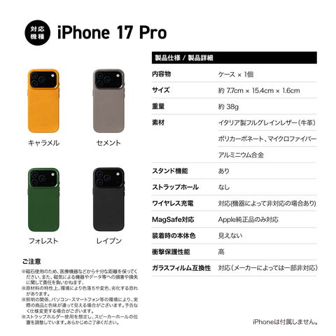 イタリア製フルグレインレザー(牛革)、ポリカーボネート、マイクロファイバー、アルミニウム合金、マグネット
