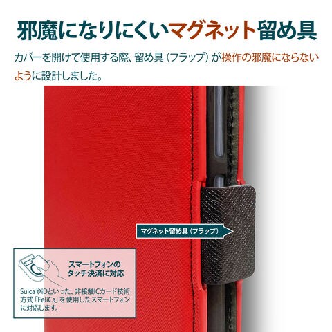 マグネット式留め具を開けた際に、留め具が操作に干渉しづらいよう、サイドに配置しております。