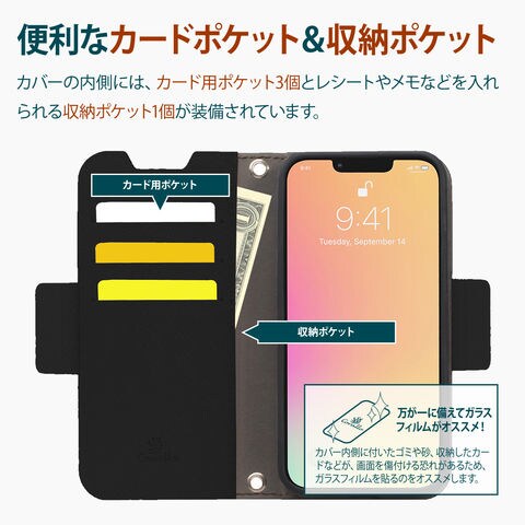フリップ内側には、収納ポケットを設けており、ICカードやクレジットカード、紙幣等を収納できます。