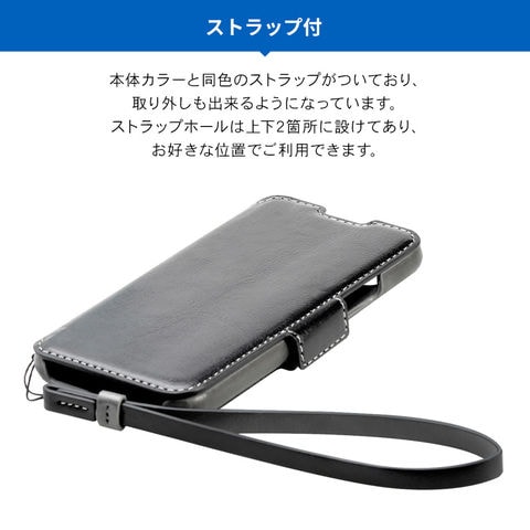 本体カラーと同色のストラップが付属しています。ケースにはストラップホールが、上下2箇所に設けてあり、使い方に合わせてストラップを結ぶ位置を変更できます。