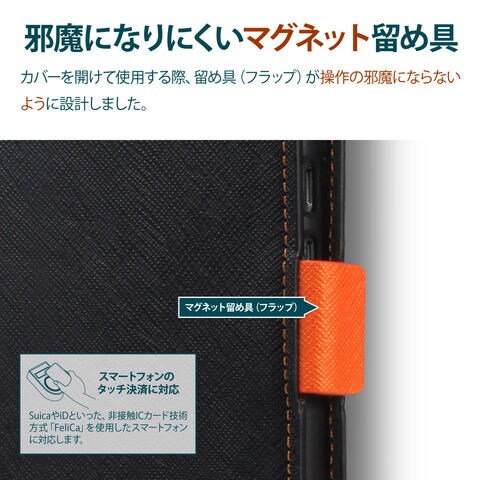 マグネット式留め具を開けた際に、留め具が操作に干渉しづらいよう、サイドに配置しております。