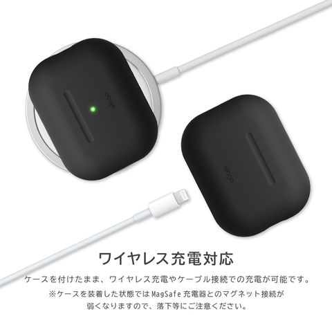 ケースを付けたまま、ワイヤレス充電やケーブル接続での充電が可能です。※ケースを装着した状態ではMagSafe充電器とのマグネット接続が弱くなりますので、落下等にご注意ください。