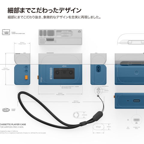 AirPods Pro2 ケース 耐衝撃 ストラップ 付 おしゃれ カバー ワイヤレス充電 シンプル AirPods Pro 2 エアポッツプロ 第2世代 対応 elago CASSETTE PLAYER CASE