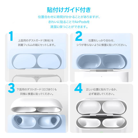 位置合わせに時間がかかることがありますが、きれいに貼ることでAirPodsを清潔に保つことができます。
