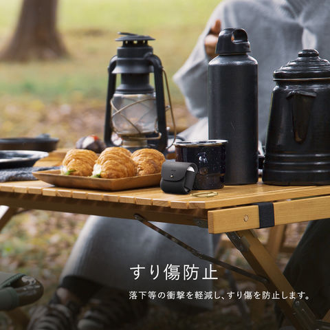 ケースの背後部にペアリングボタン位置標記があり、AirPod本体を取り出さなくてもケースを付けたまま操作できます。