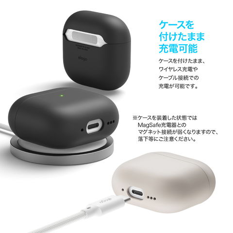 ケースを付けたまま、ワイヤレス充電やケーブル接続での充電が可能です。
