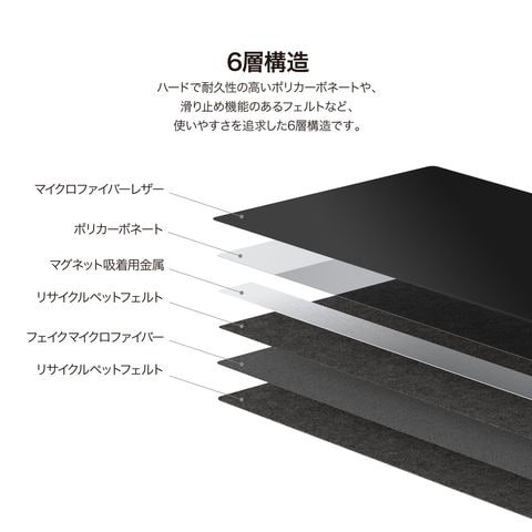 ハードで耐久性の高いポリカーボネートや、滑り止め機能のあるフェルトなど、使いやすさを追求した6層構造です。