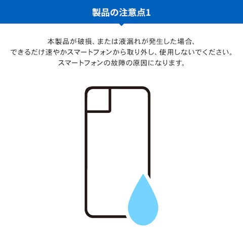 本製品が破損、または液漏れが発生した場合、できるだけ速やかスマートフォンから取り外し、使用しないでください。スマートフォンの故障の原因になります。