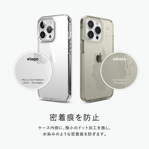 ケース内側に、極小のドット加工を施し、水染みのような密着痕を防ぎます。