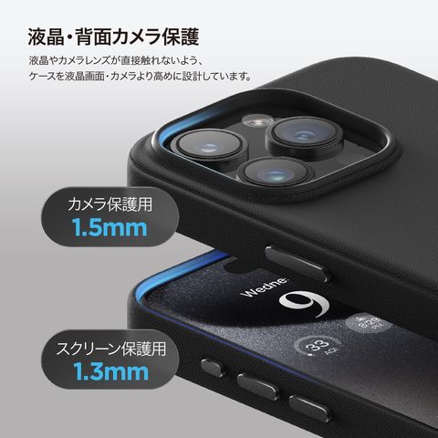 液晶やカメラレンズが直接触れないよう、ケースを液晶画面・カメラより高めに設計しています。