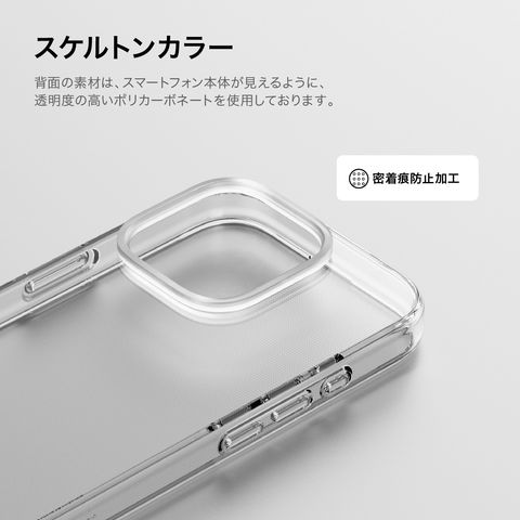 背面の素材は、スマートフォン本体が見えるように、透明度の高いポリカーボネートを使用しております。