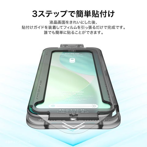 液晶画面をきれいにした後、貼付けガイドを装着してフィルムを引っ張るだけで完成です。誰でも簡単に貼ることができます。