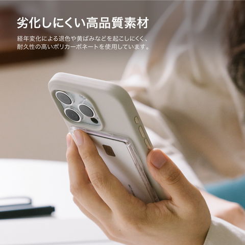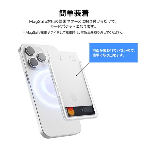 MagSafe対応の端末やケースに貼り付けるだけで、カードポケットになります。※MagSafe充電やワイヤレス充電時は、本製品を取り外してください。