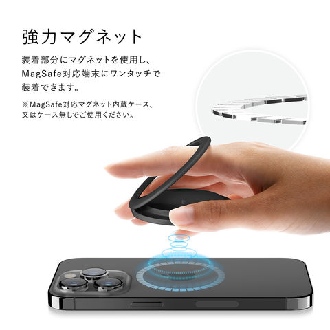 装着部分にマグネットを使用し、MagSafe対応端末にワンタッチで装着できます。※MagSafe対応マグネット内蔵ケース、又はケース無しでご使用ください。