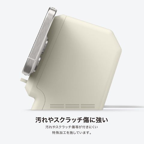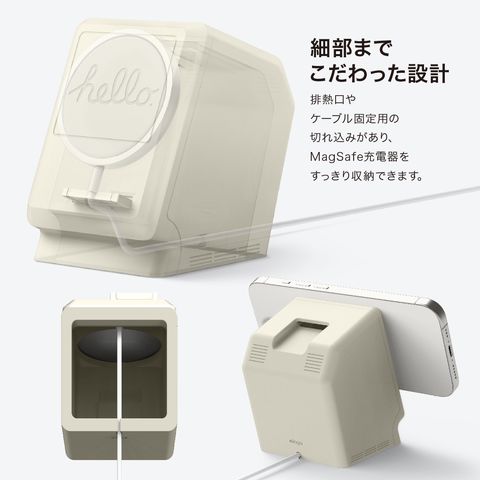 排熱口やケーブル固定用の切れ込みがあり、MagSafe充電器をすっきり収納できます。