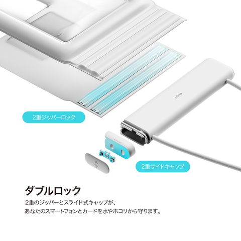 2重のジッパーとスライド式キャップが、あなたのスマートフォンとカードを水やホコリから守ります。