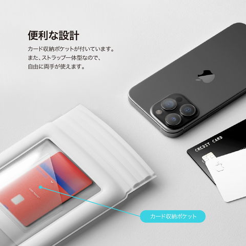 カード収納ポケットが付いています。また、ストラップ一体型なので、自由に両手が使えます。